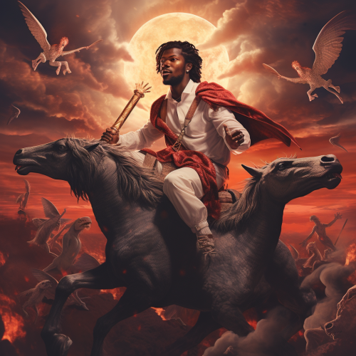 Jesus is flying down earth with his angels and Satan Snake with Lil Nas X riding on it looking at Jesus