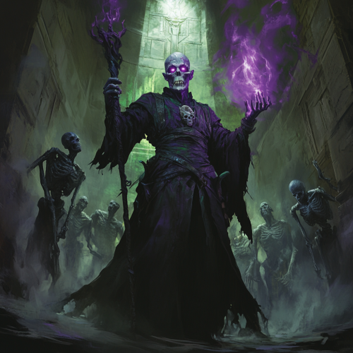 "Create a dark, ominous sorcerer standing in the center of a shadowy, decaying throne room. He has pale, gaunt features with deep-set, glowing violet eyes. His long, tattered robes are adorned with ancient runes that flicker with a malevolent, dark energy. In one hand, he holds a staff topped with a skull engulfed in ghostly green flames, and in the other, a glowing black crystal pulsing with necrotic power. Behind him, skeletal figures rise from the ground, their eyes hollow and soulless. The room is filled with dark, swirling mist, and arcane symbols etched into the walls pulsate with a dim, eerie light. The atmosphere is filled with dread, as though the very air is suffused with the souls of the damned.