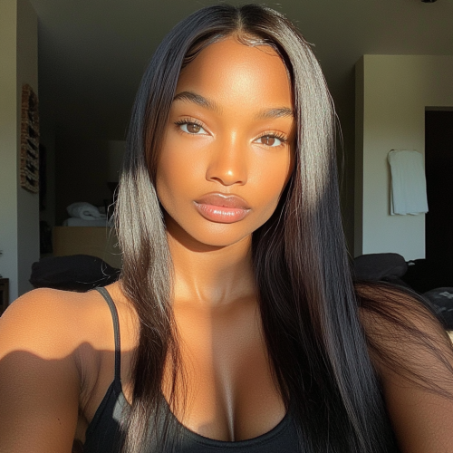 Selfie of a a gorgeous black woman. She’s naturally beautiful with RICH BROWN SKIN, resembling the actress Megan Good. She has long straight dark hair. No makeup! A girl next door vibe. No smiling!