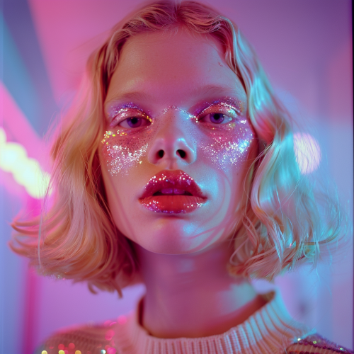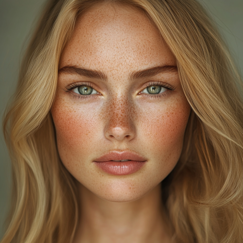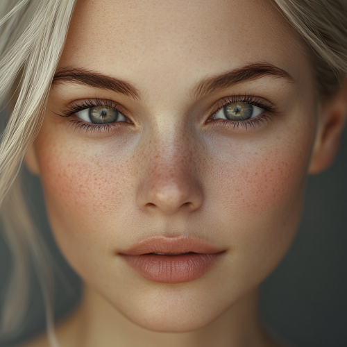 a realistic photo portrait of a beautiful woman facing forward, looking directly at the camera, ultra-realistic blonde, realistic moisturized skin, makeup, realistic arched eyebrow