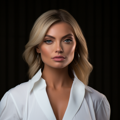 Beautiful 28 year old blonde model woman. Wearing a white fitted deepcut blouse. full makeup, eye shadow, eyeliner, mascara. Medium headshot. brightly lit model. Body like kim kardashian. Dark background at night. 8k instagram photo. --v 5.2 --style raw