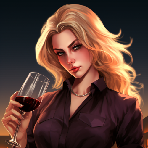 beautiful blonde anime girl holding a glass of red wine, curvaceous body
