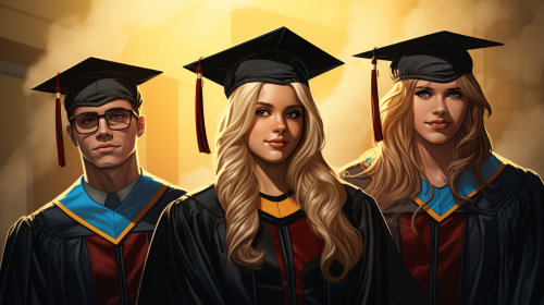 handsome black teen boy, latina teen with glasses, asian teen boy with braces, blue-eyed caucasian girl and blonde-haired caucasian boy, all wearing graduation cap and gown, looking confident and full of promise, style of Marvel and DV comics, --ar 16:9