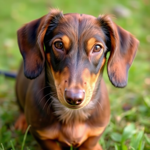 A festive digital composite photograph features a central subject of a textured, dark brown and tan wire-haired Dachshund wearing a traditional Santa Claus costume. The dog is seated in an ornate wooden sleigh filled with an assortment of wrapped gifts in gold and red paper, tied together with silver ribbons. It dons a vibrant red Santa suit with white fur trim and a black belt, complemented by a fluffy red hat adorned with a white pom-pom and delicate snowflakes on its surface. The dog's expressive amber eyes look directly at the viewer, adding to the whimsical mood. Two light brown reindeer with prominent antlers are visible in the foreground, facing slightly towards the camera. They appear to be part of the scene, possibly pulling the sleigh. The background depicts a magical nighttime setting with a large, bright full moon glowing in the upper right corner, casting a soft yellowish light. The moon's surface shows intricate details like craters and rays. A dark navy blue night sky is dotted with numerous twinkling stars and scattered falling snowflakes, creating a serene atmosphere. To the left, there is a faintly visible evergreen tree, contributing to the wintry ambiance. The overall color palette includes deep reds, rich browns, golden yellows, cool whites, and warm blacks, enhancing the holiday spirit and creating a balanced composition with high contrast and saturation --s 750 --v 6.0