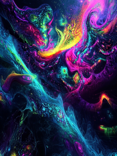 Create an abstract art piece that combines elements of surrealism and vibrant, electric colors. Imagine a cosmic landscape where fluid, translucent shapes intertwine with sharp, geometric patterns. Incorporate a neon color palette with luminous shades of turquoise, magenta, and lime green, contrasted against deep, shadowy backgrounds. The composition should evoke a sense of otherworldliness, blending organic forms with futuristic, digital aesthetics. The overall design should be both visually striking and slightly disorienting, capturing the viewer’s attention with its bold, unconventional style. --ar 3:4