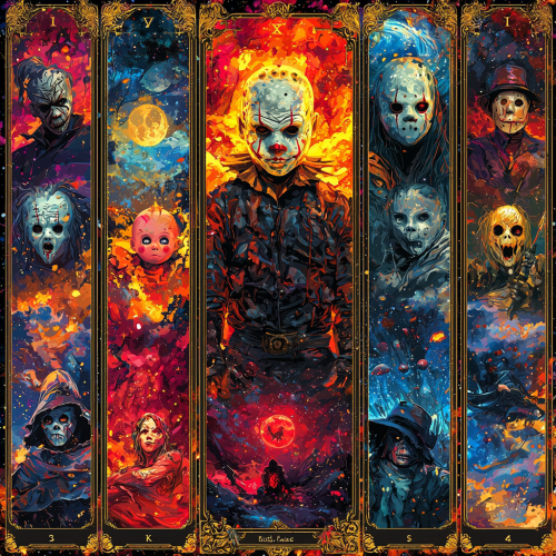 A collection of tarot cards featuring iconic horror movie characters in a vibrant, cosmic art style. Each card showcases a different character: 'The Slasher' with a menacing figure like Michael Myers, 'The Killer' featuring a doll-like figure resembling Chucky, 'The Dreamer' with Freddy Krueger, 'The Clown' with a sinister clown resembling Pennywise, 'The Camper' with a masked figure resembling Jason Voorhees, and 'Ghost Face' in the center with a haunting ghostly mask. The background is filled with colorful, dreamy clouds, stars, and celestial elements, combining a dark, eerie atmosphere with a psychedelic, outer-space theme. The tarot card frames are ornate, with intricate detailing, and each character is depicted with intense expressions and vibrant, glowing highlights. --ar 2:3 --quality 2 --stylize 750 --v 6.1