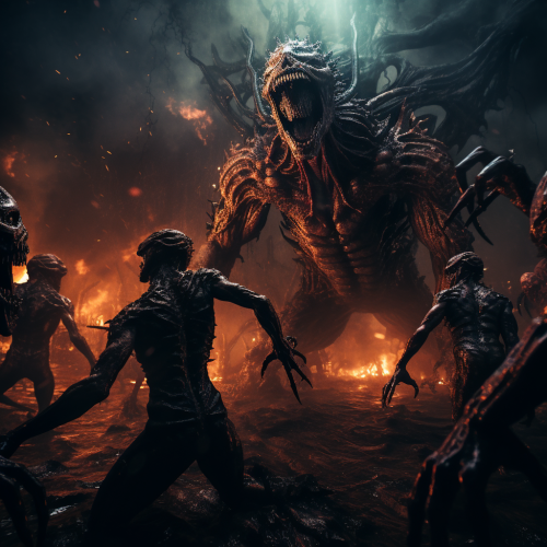 In a high-quality acrylic painting, a grotesque cosmic horror evokes terror with sharp, detailed, deformed limbs, razor-sharp teeth, and eerie luminescence. Deep purples and blacks create cosmic dread. Expect the best quality and sharp details in this meticulously crafted, haunting image. --s 500 --v 6.0