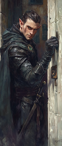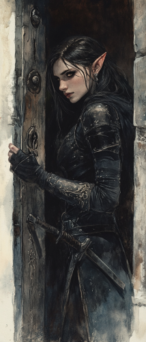 A female elf rogue in dark leather armor picking a door lock. Dark fantasy setting. Mood is eerie and ethereal. Smooth watercolor art style. Watercolor background is partially white around the edges. --ar 3:7