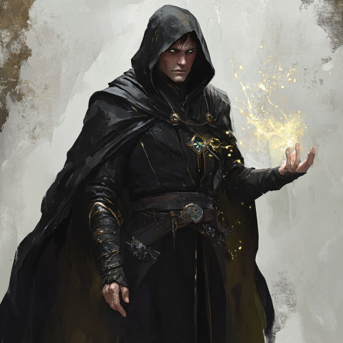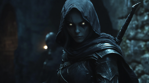 male wood elf rogue looking stealthy and mysterious wearing a black cape and a hood, holding a daguer in the hand and walking slowly towards the the viewer