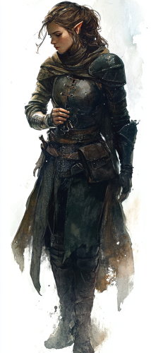 A female elf rogue in dark leather armor looking over her shoulder. Dark fantasy setting. Mood is eerie and ethereal. Smooth watercolor art style. Background is white watercolor around the edges. --ar 3:7