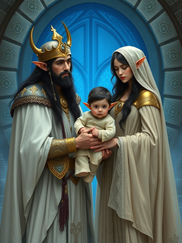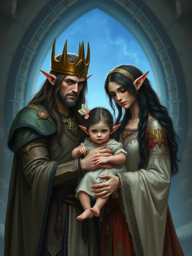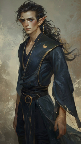 a male elf with tousled black hair, long ears, blue eyes, wears black pants and a loose dark blue tunic, he wears a moon amulet. --ar 9:16 --v 6.0
