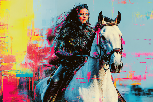 Full photograph of a beautiful woman daydreaming with open eyes, she has a light makeup, she is riding a beautiful white horse, ethereal art, 4D, emotional art, bright colors, negative colors, shapes are fluid and undefined, high definition digital art, negative color, a mix of pastel colors and neon, a poetic and creative perspective, inspired by Man Ray's visionary photography, large-screen camera, photo art that is also inspired by digital art, cold color scale with hints of flickering neon, --ar 5:4 --p teqj53c --s 500