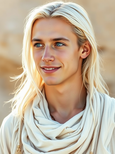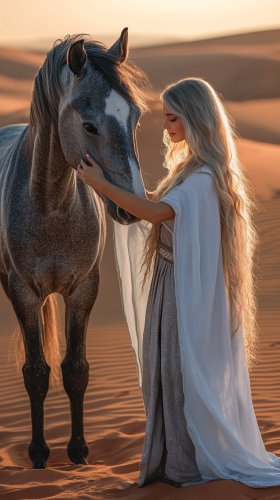 beautiful long blonde hair female in ancient white cape and tunic with pants, gently smiling, touching heads with dark dapple gray horse with white mane and tail with hand on horses head, sunlight, red desert dunes, 8k detail, shot on a Sony Alpha a7 III camera --ar 9:16