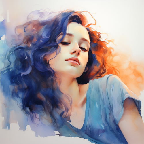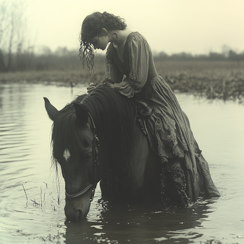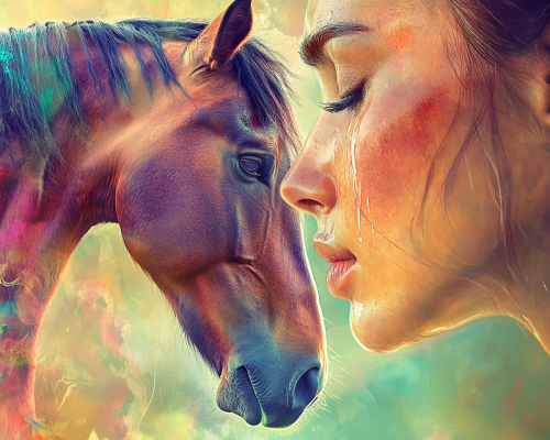 a beautiful woman daydreaming with open eyes, staring with empty eyes into the horizon, her beautiful brown horse is waiting patiently by her side bending down as if grazing , the woman has a light makeup, you can see she has cried, emotional art with bright colors and negative colors, shapes are fluid and undefined, high definition digital art, a mix of pastel colors and neon, a poetic and creative perspective, inspired by Man Ray's visionary photography, large-screen camera, photo art that is also inspired by digital art, cold color scale with hints of flickering neon, --ar 5:4