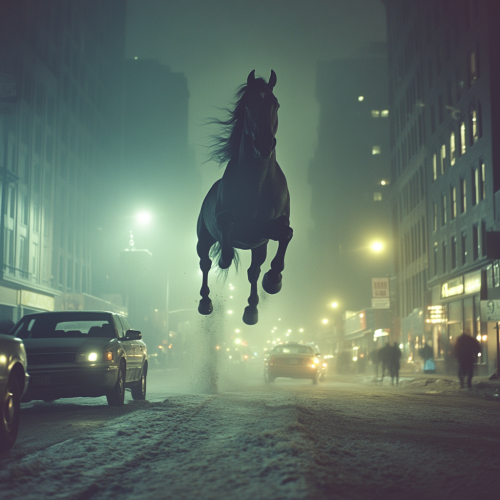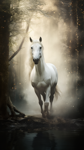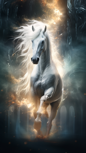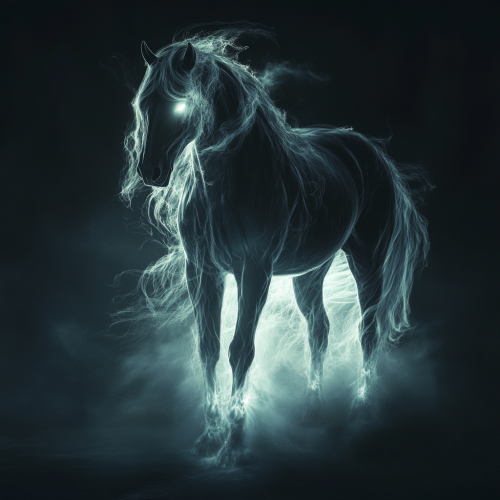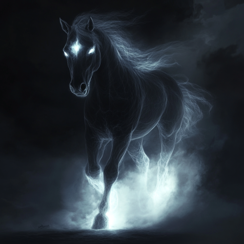A hyper realistic image of a horse with a dark and mystical appearance. The horse's body is completely black, like a shadow, with no visible details except for its stark, white glowing eyes. It has a flowing white mane that contrasts against its dark body, giving it an ethereal look. The horse's hooves are also white, emitting a soft, eerie light. A white mist emanates slowly from its hooves, adding a ghostly and supernatural effect. The background is dark, enhancing the glowing features and the shadow-like body of the horse.
