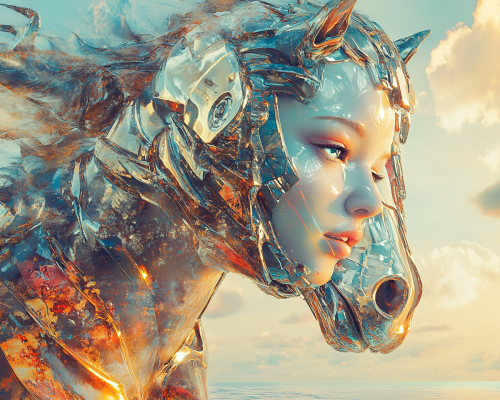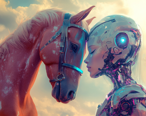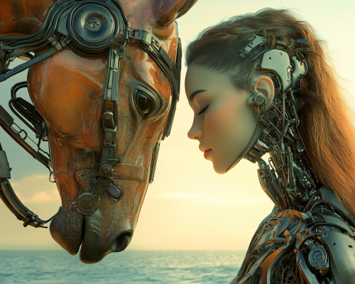 a beautiful robotic woman daydreaming with open eyes, her beautiful brown cyborg horse is waiting patiently by her side, she has a light makeup, the woman is standing in front of the sea , the horse looks lovingly at her, emotional art, bright colors, negative colors, shapes are fluid and undefined, high definition digital art, negative color, a mix of pastel colors and neon, a poetic and creative perspective, inspired by Man Ray's visionary photography, large-screen camera, photo art that is also inspired by digital art, cold color scale with hints of flickering neon, --ar 5:4 --personalize 7gogb9o