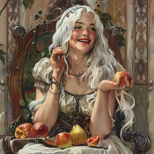 An art nouveau illustration of a radiantly beautiful young woman in her 20s with long, wavy silver-white hair woven into a loose braid. She is smiling peacefully as she snacks upon fruit. Medieval fantasy setting, full body angle