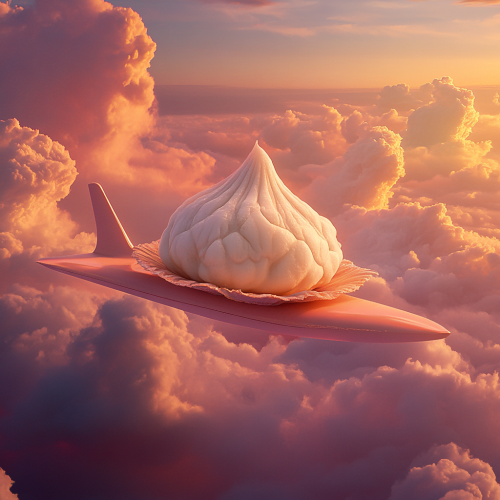 A delicious modak sitting on a flying airplane, captured in a vibrant realistic sky, bright clouds, soft sunlight, stunning detail, dynamic perspective --ar 1:1