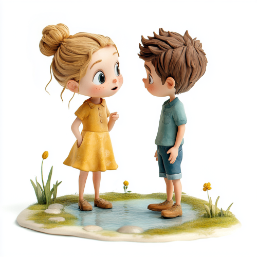 cute girl (with blond hair bun, yellow dress, brown shoes, smiling, 2 arms with each 5 fingers) and a little boy (with brown hair, a blue short pants, a green dottet shirt, brown white shoes, 2 arms with each 5 fingers) talking to the wind, wind, trees, some flowers, cartoony character, organic forms, evening, airy pastel color palette, spring colours, soft watercolour by liniers, white background,. 3d
