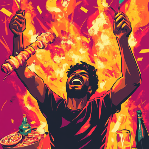 birthday party graphic for a party in FM mangal in camberwell london. Big kebabs, flames, smoke, charcoal, fun, drinks. vibrant. party, fun. laughing.