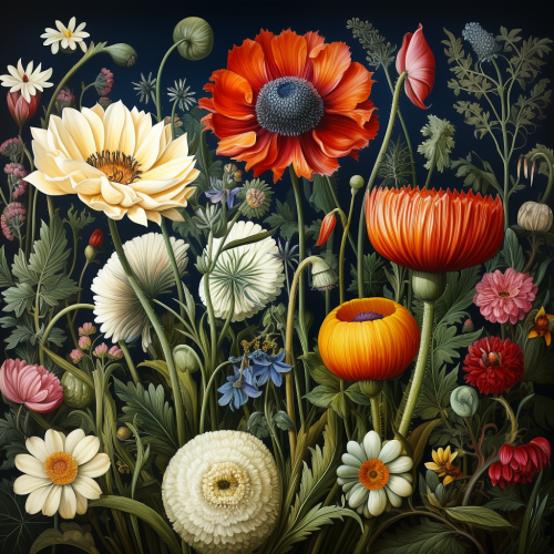 beautiful spring flowers, the the background is a beautiful detailed airbrushed painting of a beautiful detailed garden, very realistic flowers, --no stream, --no path, ar 16:9, ~~v5.2 --s 750 --v 5.2