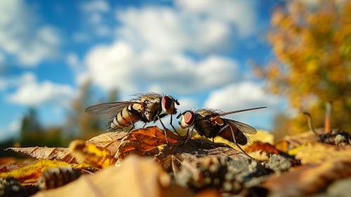 Between winter and spring, 2 flies sit on top of each other between old and new leaves on the ground, sunny day, blue sky with white clouds --ar 16:9 --v 6.0