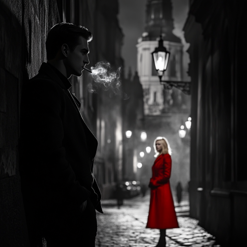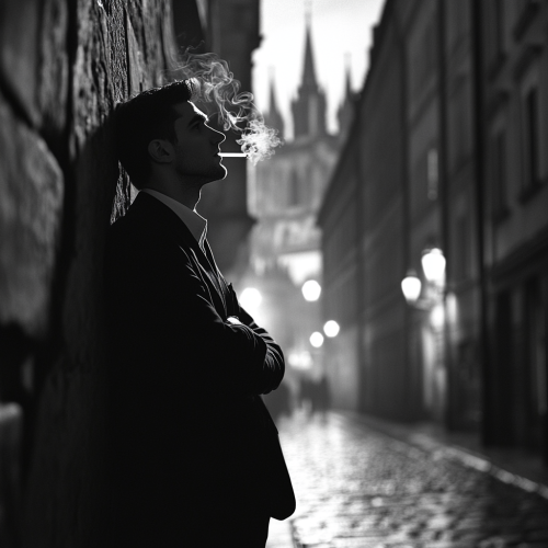 a man, young beautiful spy, leaning against a wall watches the street of old Prague, from street is a view of the famous Prague monument, he is an CIA agent, he smokes a cigarette, cigarette smoke rises in the dark, a blonde woman is coming to dressed in a red costume, he is blured, black and white very detailed photo, dark alley and atmosphere