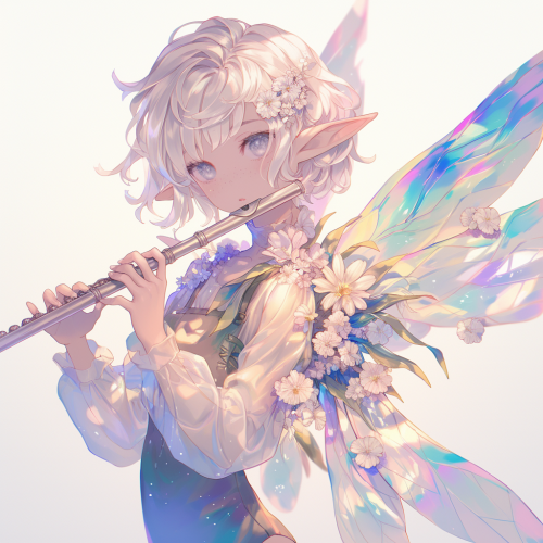 small ethereal fairy, adult body, large point ears, light skin, white hair, white eyes, many white freckles, iridescent slight shimmer fairy wings, adventurer clothing with natural elements like flowers, playing a small flute, 90s anime style, action shot --niji 6