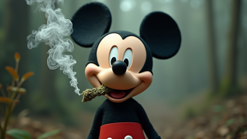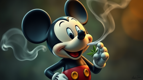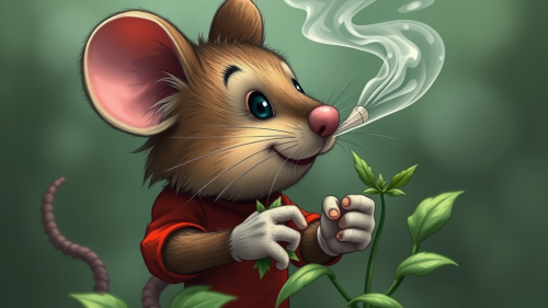 cartoon drawing, monkey smoking a joint chasing a mouse in the jungle, beanie