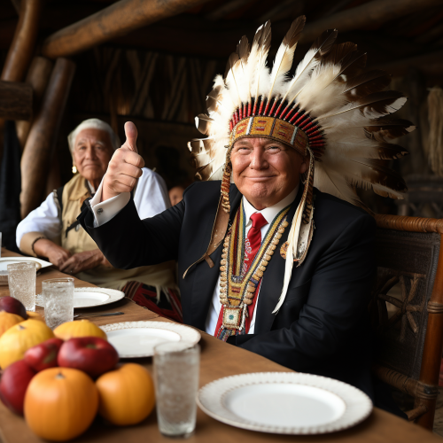 Donald Trump giving thumbs-up while sitting down at a wooden table for a Thanksgiving feast with traditionally dressed native Americans