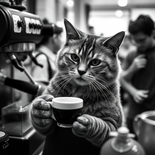 masterpiece cup of coffee; contemporary style; sugar bowl and creamer on counter; rim lighting; iridescent gold; minimalistic