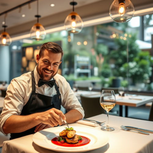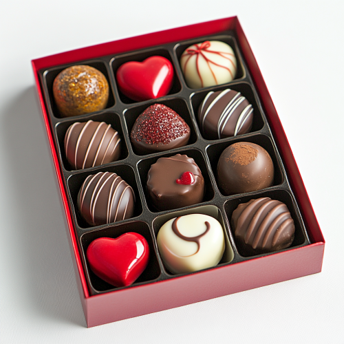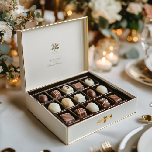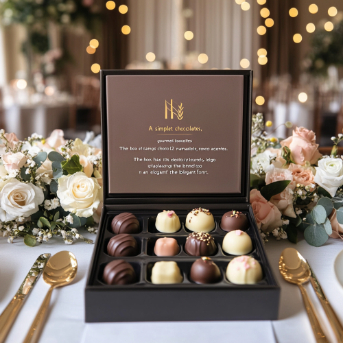 "A simple, elegant box of gourmet chocolates, containing 12 neatly arranged chocolates. The box has a minimalistic, luxurious design with subtle gold accents, and its lid is placed to the side, clearly displaying the brand's logo in an elegant font. The box is set on an intricately decorated table, featuring a white linen tablecloth, delicate floral centerpieces, and golden cutlery. Soft, warm lighting enhances the luxurious atmosphere. In the background, a beautiful wedding event unfolds, with fairy lights hanging from trees, and guests seated at tables decorated with flowers and candles. The focus remains on the chocolate box and its logo, but the elegant wedding scene adds depth and richness to the composition, creating a sophisticated and high-end aesthetic suitable for a wedding magazine cover."