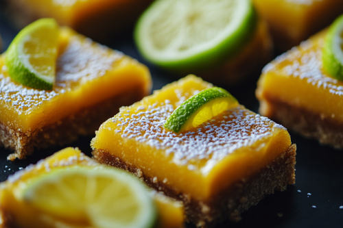 STYLE: Close-up Shot Top view | EMOTION: Tempting I SCENE: Key Lime Bars | TAGS: High-end food photography, clean composition, dramatic lighting, luxurious, elegant, mouth-watering, indulgent, gourmet | CAMERA: Nikon Z7 | FOCAL LENGTH: 50mm | SHOT TYPE: Close-up | COMPOSITION: Top view Centered | LIGHTING: Soft directional light | PRODUCTION: Food Stylist --ar 3:2