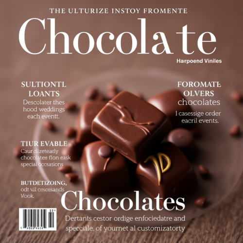 "Design a magazine cover (including text) for a brand of artisanal gourmet chocolates that specializes in creating custom orders for events like weddings and special occasions. The cover should feature an elegant, luxurious design, showcasing the high-end chocolates and emphasizing the brand's ability to personalize each order. Include sophisticated typography for the brand name and tagline, along with other text elements highlighting the customization services offered for events. The overall composition should feel refined, appealing to upscale clientele looking for bespoke gourmet chocolates for their special moments.