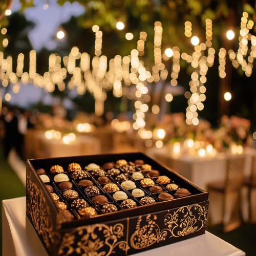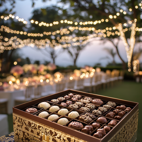 A luxurious box of gourmet chocolates, fully visible and centered in the foreground. The box features intricate gold designs, with chocolates neatly arranged inside. In the background, a beautifully set wedding event is visible, featuring elegantly decorated tables with white and gold tablecloths, delicate flower arrangements, and soft, romantic lighting. The outdoor setting is at sunset, with fairy lights strung between trees, creating a magical, elegant atmosphere. The focus is on the box of chocolates, but the wedding ambiance is clearly present in the background – high-end, elegant, and sophisticated.