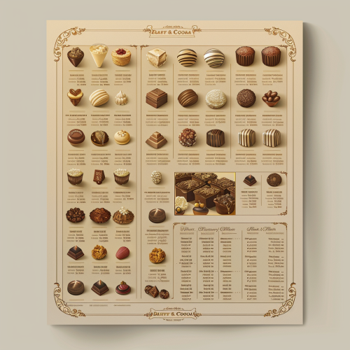 A visually appealing menu design for 'Date & Cocoa'. The menu should feature sections for dates and chocolates, with items and prices listed. Use warm, luxurious colors like gold and beige. The design should be elegant, with the 'Date & Cocoa' logo prominently displayed at the top, and an easy-to-read layout. Include images of dates and chocolates next to their descriptions to enhance visual appeal. The overall design should be sophisticated and suitable for a high-end confectionery brand. --s 250 --v 6.0