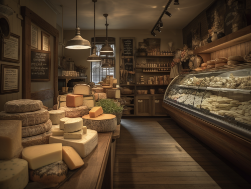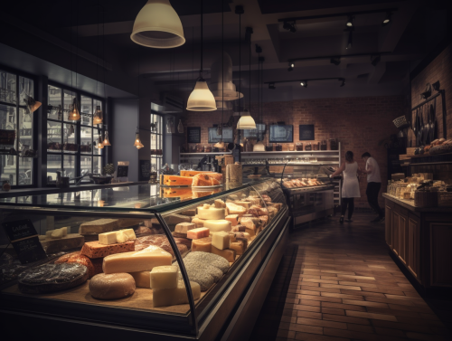 fashion photography of inside of a gourmet cheese and meat store shot on canon eos 6d. ef 16. 35mm/ 2. 8 ii usm. natural light --v 5.0 --ar 4:3