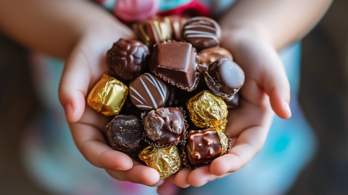 A close-up image of the small hands of a young girl, holding a large pile of assorted chocolates. The chocolates vary in shape and size, some wrapped in colorful foil, others unwrapped to reveal their rich, textured surfaces. The girl's hands are small and delicate, slightly cupped to cradle the chocolates carefully. The focus is on the hands and the chocolates, with soft, warm lighting creating a cozy and inviting atmosphere. The background is softly blurred to emphasize the richness and variety of the chocolates, adding a sense of warmth and delight to the scene --ar 16:9