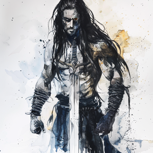 Dnd character art of a hunched over disheveled human male with long black hair and beard, thin body with a gaunt face, holding an ornate sword made from a meteorite, simple black ink and light watercolor --v 6.0