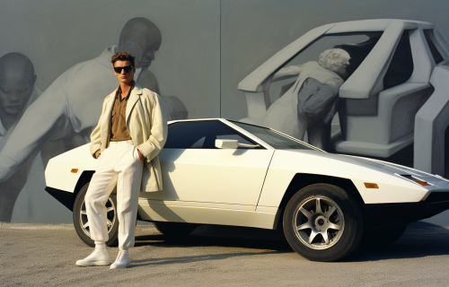 1989 billboard for the 1989 lamborghini Urus SUV, Painted white, with AMG Hammer rims, man with trench coat and mullet and ray bans standing beside car, --ar 14:9 --s 50