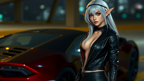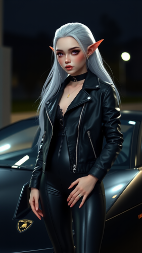 dark night elf girl with white hair, in lather jacket and black leggings, standing near car, car is lamborghini, elf ears, purples eyes, Best quality, Photorealistic, detail, very detailed, detailed skin texture, in a black suit, (Best quality,4K,Ultra detailed, realistic), Round breasts:0.9. the image is realistic, very detailed. very high resolution, 8K rendering, (absurdity, A high resolution, ultra detailed), masterpiece, (resident Evil)