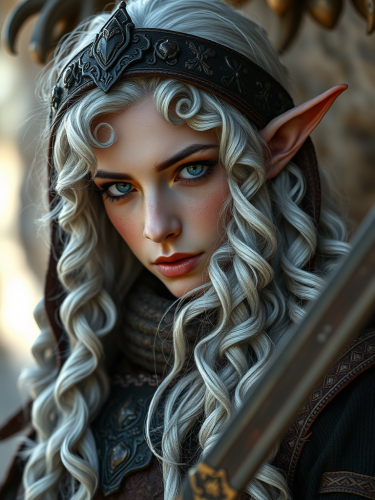 Half elf, girl, rogue class, dnd character, leather armor, tightly wrapped with straps on hips and limbs. Peculiarities: long elf ears, a noticeable scar on the right ear. Light colored skin, reddish-red hair