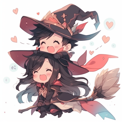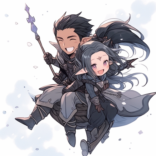 a cute assassin elf girl and a male paladin sitting together on a magical broom flying in the air, the girl has a large bow and black hair, the paladin is wearing shiny white armour, looking comical and cute, chibi style, clean --niji 5