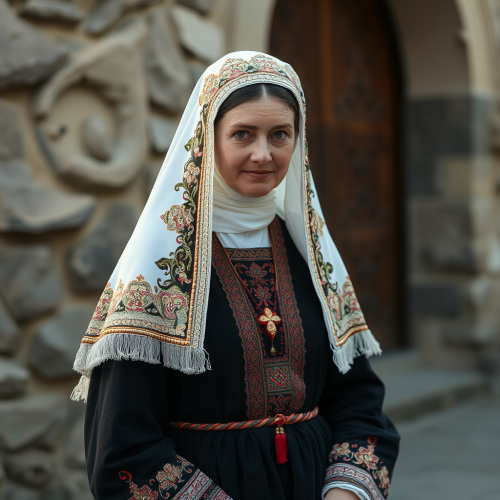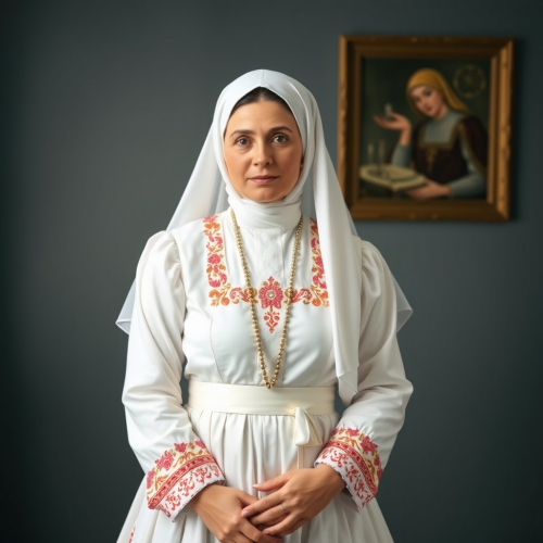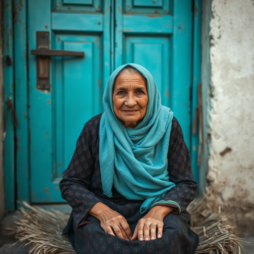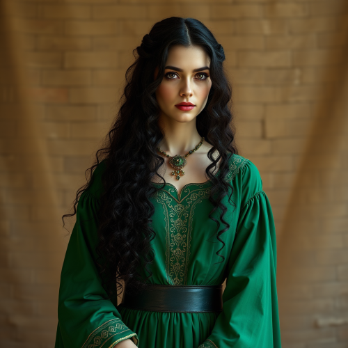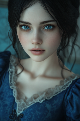 beautiful young woman, oval face, black hair, expressive blue eyes, pale skin, simmetric mouth, secretly soft smile, blue victorian dress, photorealistic, high resolution --ar 2:3