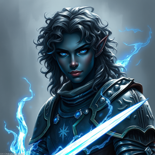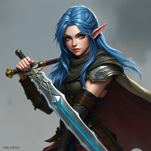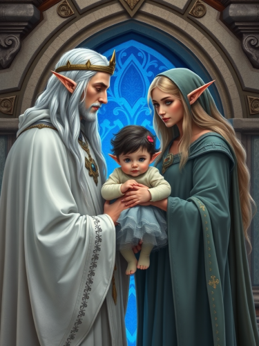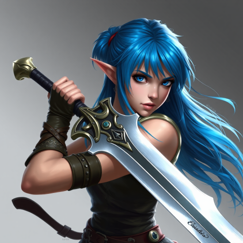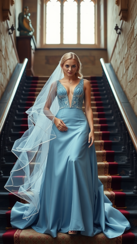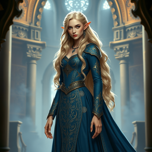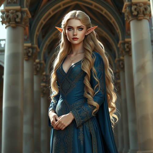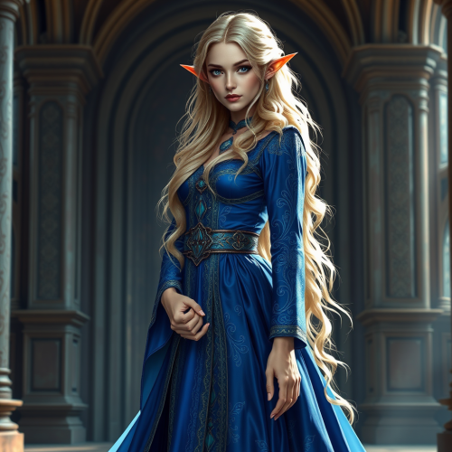 Elf Woman in Blue Dress in Medieval Palace