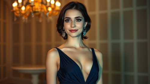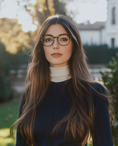DVD, a brunette woman with glasses in a bando deep blue dress with a white turtleneck in the garden of a mansion ein the evening, with long hair, a sharp face, soft skin, natural lighting, low contrast, and muted colors. --ar 35:43 --style raw
