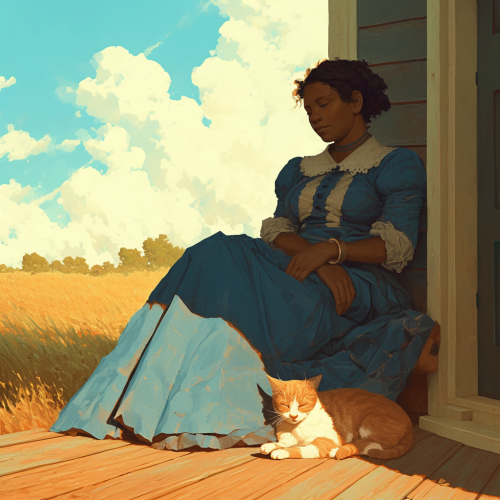 plus size black woman with dark skin wearing blue house dress sits on the porch of her homestead with her White House cat sleeping near her feet in 1896 --niji 6