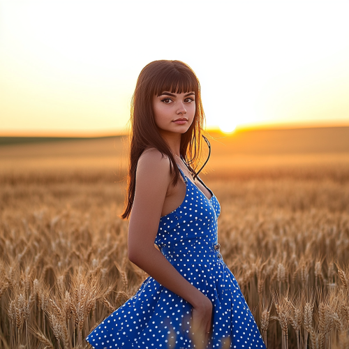 a 23 year old brunette woman in blue polkadot sundress in a wheat field, standing, she is facing camera in an innocent expression, with one hand behind back hiding a small short iron rod behind her, at sunset --no sharp tip --s 50