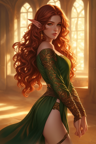 beautiful woman, pointed ears, long red wavy hair, standing, Elf, long ornate green dress, medieval fantasy, palace background, dynamic lighting, --niji 6 --ar 2:3