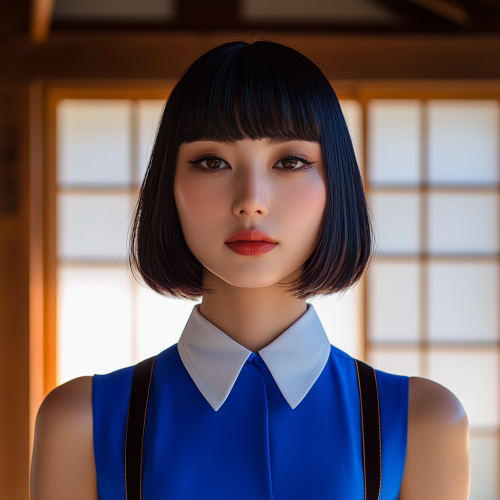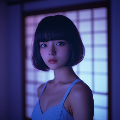 Realistic photo. A dark purple silhouette of a Japanese woman with round short hair and bangs poses for the camera wearing a light blue dress with straps from the shoulders over a white dress shirt. In the background you can see the shoji paper of a Japanese mansion.